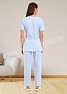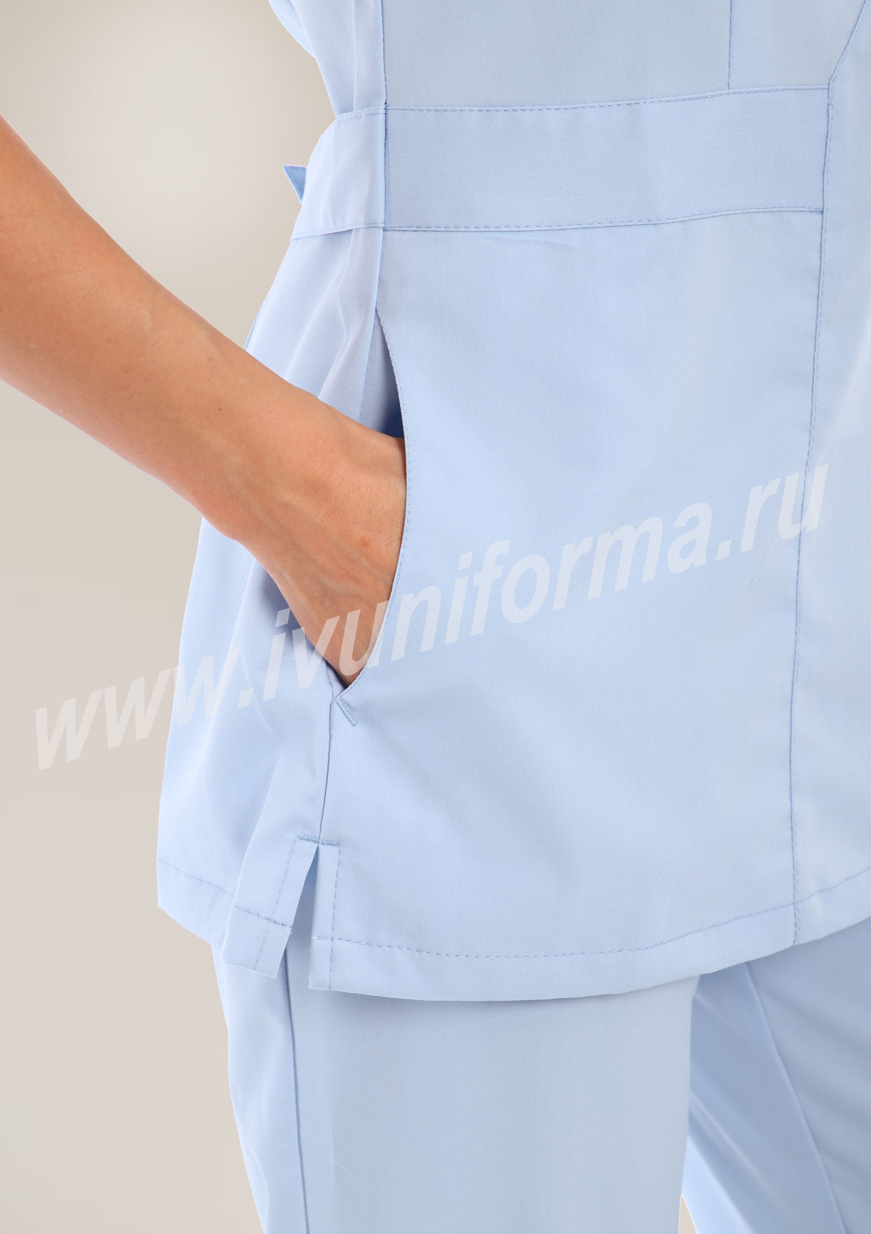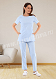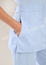 Современный женский костюм состоит из куртки и брюк. Куртка прилегающего силуэта средней длины с округлым вырезом горловины. В нижней части полочки расположены внутренние боковые карманы с фигурным входом. Рукава втачные, короткие. Спинка с рельефами, выходящими из плечевых швов. Объем по талии регулируется с помощью двух полупоясов с застежкой на кнопки. Брюки прямые на эластичном поясе имеют два внутренних кармана с косой линией входа. Костюм предназначен для медицинских работников. Костюм выполнен из легкой дышащей ткани с добавлением эластичных нитей, обеспечивающей комфорт в течение всего дня, предназначен для медицинских работников и персонала СПА салонов.