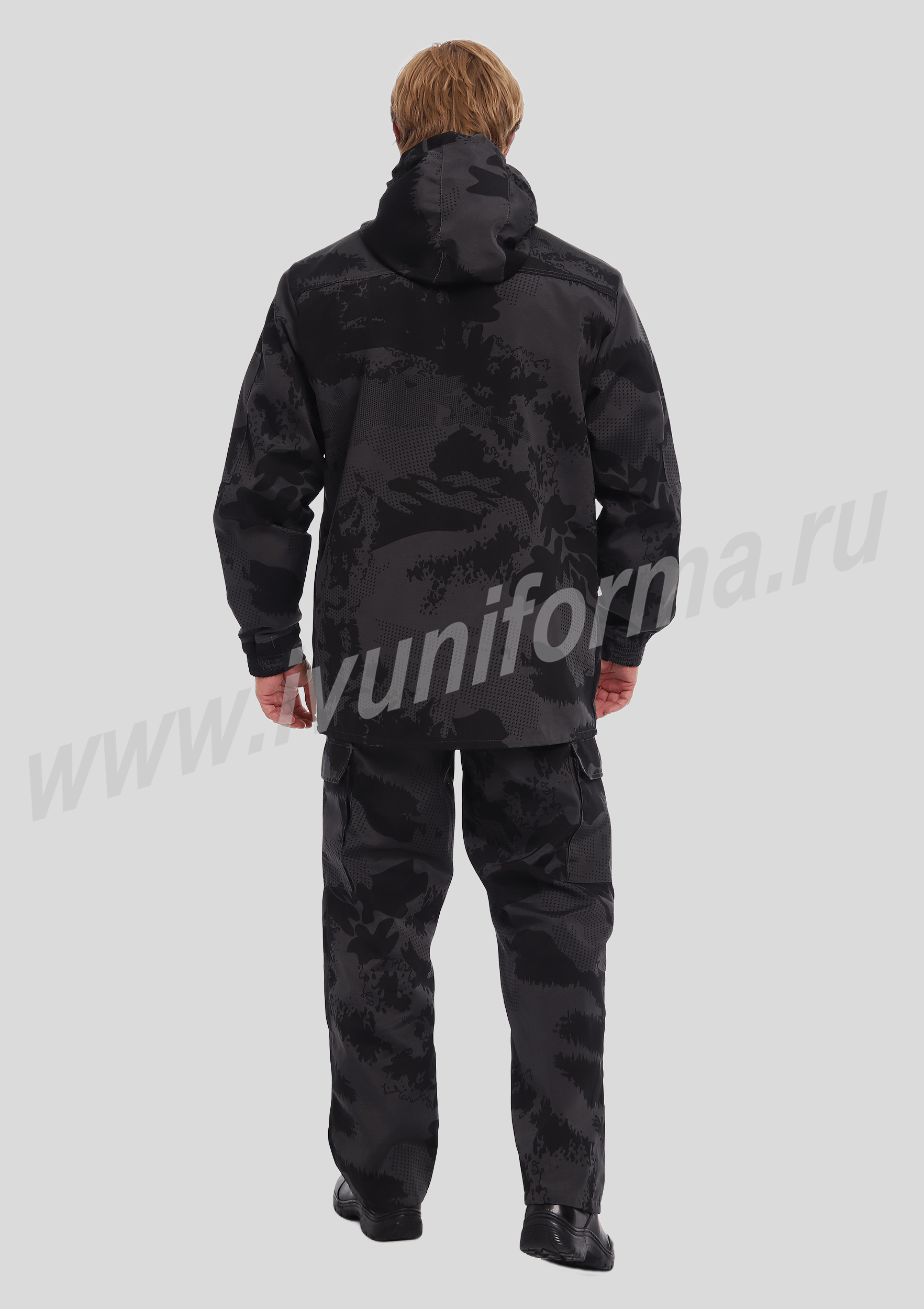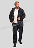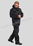 Костюм мужской состоит из куртки и брюк. Куртка удлиненная прямого силуэта, с застежкой на тракторную молнию с ветрозащитным клапаном на липучках "Velcro", воротник-стойка. На куртке два нагрудных кармана с косым входом на молнии и два нижних накладных кармана с клапанами и застежками на липучку "Velcro". Куртка имеет капюшон с возможностью регулировки объема . На рукавах куртки расположены карманы с застёжкой на молнию.